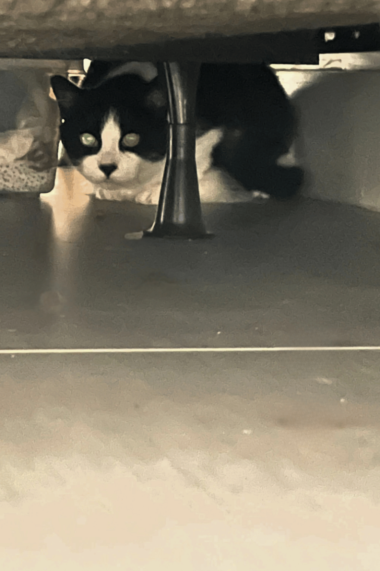 - Activity: Partial hiding — sitting behind furniture, hugging the walls, or peeking from under a table