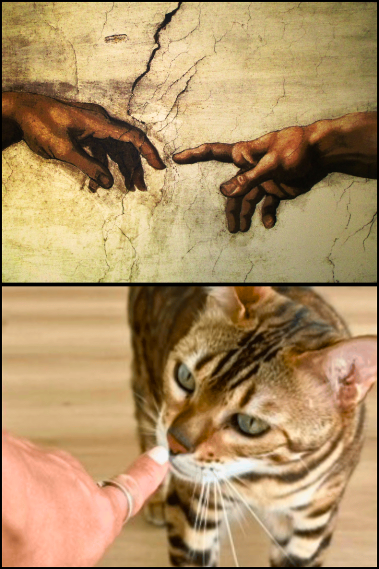 When the cat approaches, extend a finger slowly — think Michelangelo-style — to invite a sniff or gentle nose touch.